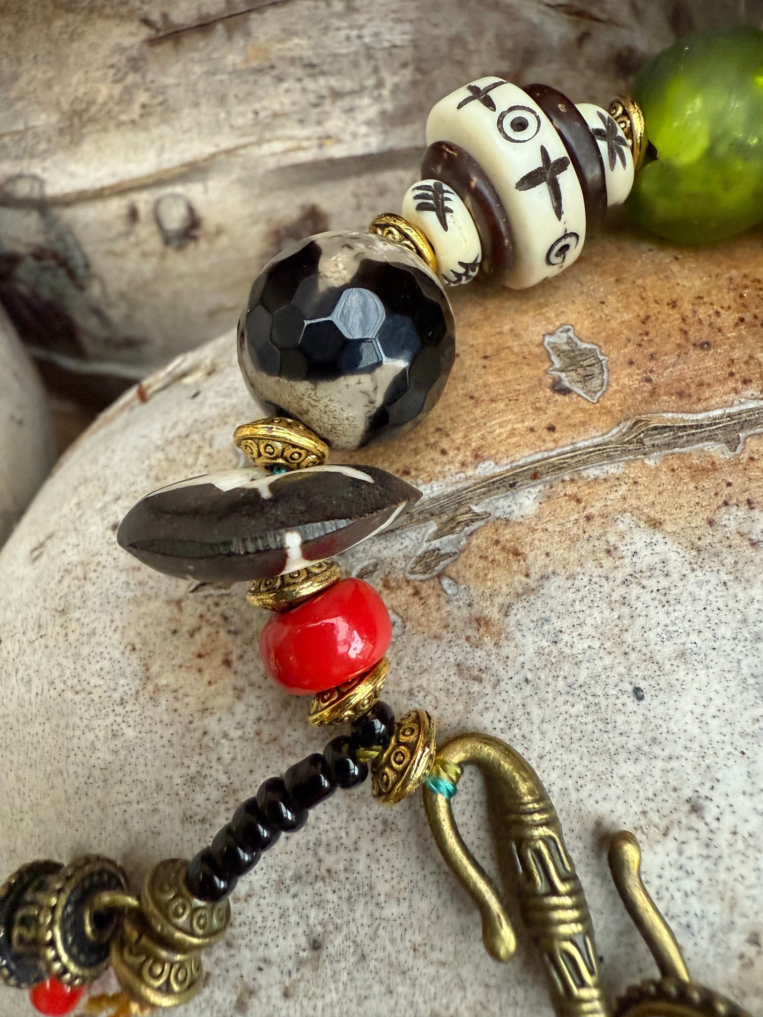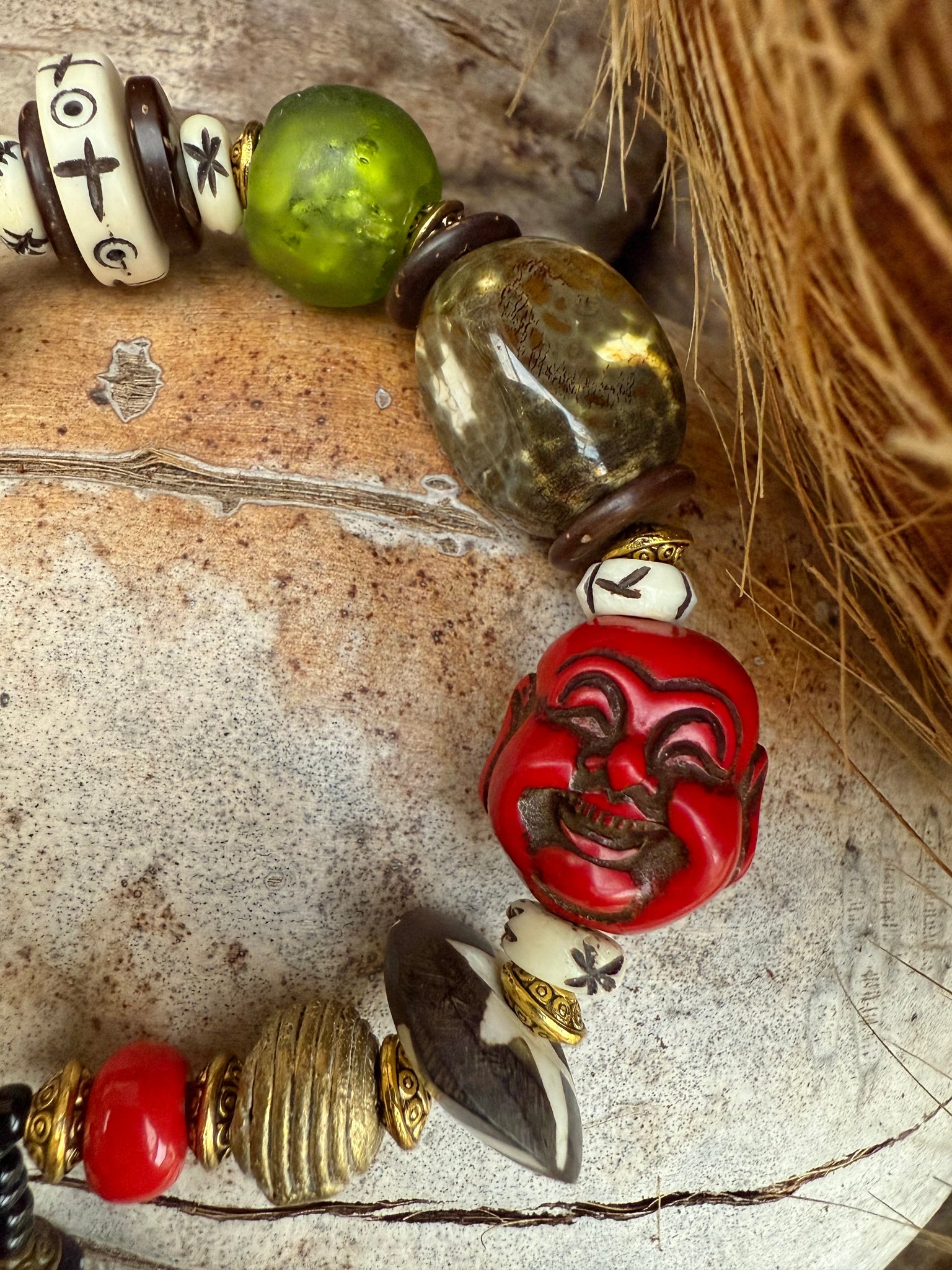 Inspired by my trip to African and Tibet. Mixing them together with colours of beauty. This striking bracelet combines bold tribal artistry with vibrant colour. Bracelet features a bold red carved shell face on both sides, paired with African green glass, tribal-patterned creamy beads, African carved wood beads and a large brown agate stone. Threaded up on soft thick cord with a few tribal charms on the end. Finished of with large brass hook. (N0B36) Adult size wrist 10-12  20cm in length - 8 inches long
